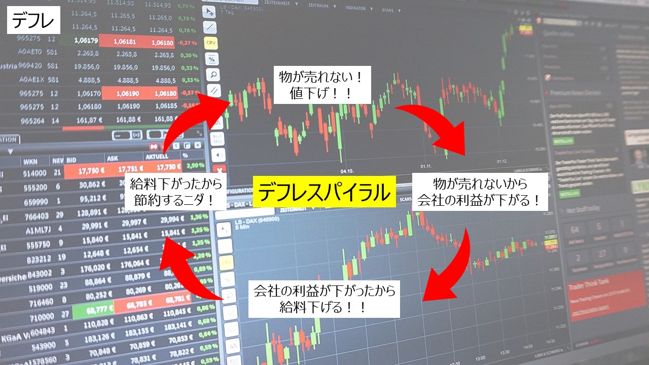 アメリカとかだと年間2~5%インフレし続け経済成長しています。適度なインフレは需要を喚起する傾向にあるのです。なぜインフレが需要を喚起するかわかりますか?【インフレになる=物価が高くなる】だったら物価が高くなっていくんだったら需要はなくなるんじゃないの?と感じると思います。実は逆なんです。購入したいものが、ある日を境に値段が上がるとなったら値上がり前に購入しますよね。逆にデフレの場合は待てば待つほど物価が安くなるという事です。ということは購入は後回しになります。そうなると『物が売れなくなる→会社の利益が下がる→給料が下がる→消費者が節約志向になる→物が売れなくなる』の繰り返しでデフレスパイラルに陥りもっと不景気になっていきます。