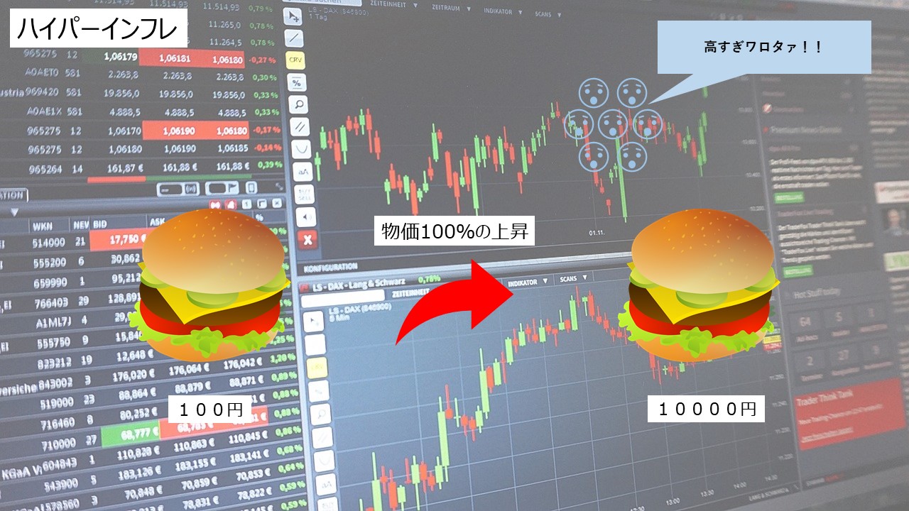 あなたが100万円の資産を持っているとします。1つ100円のハンバーガーがあるとするとこれが4年間で1つ10000円にまで値上がりしてしまいます。4年前まではこんなにもハイパーインフレになると頑張って貯めた貯金も勝手にその価値が激減してしまうんです。